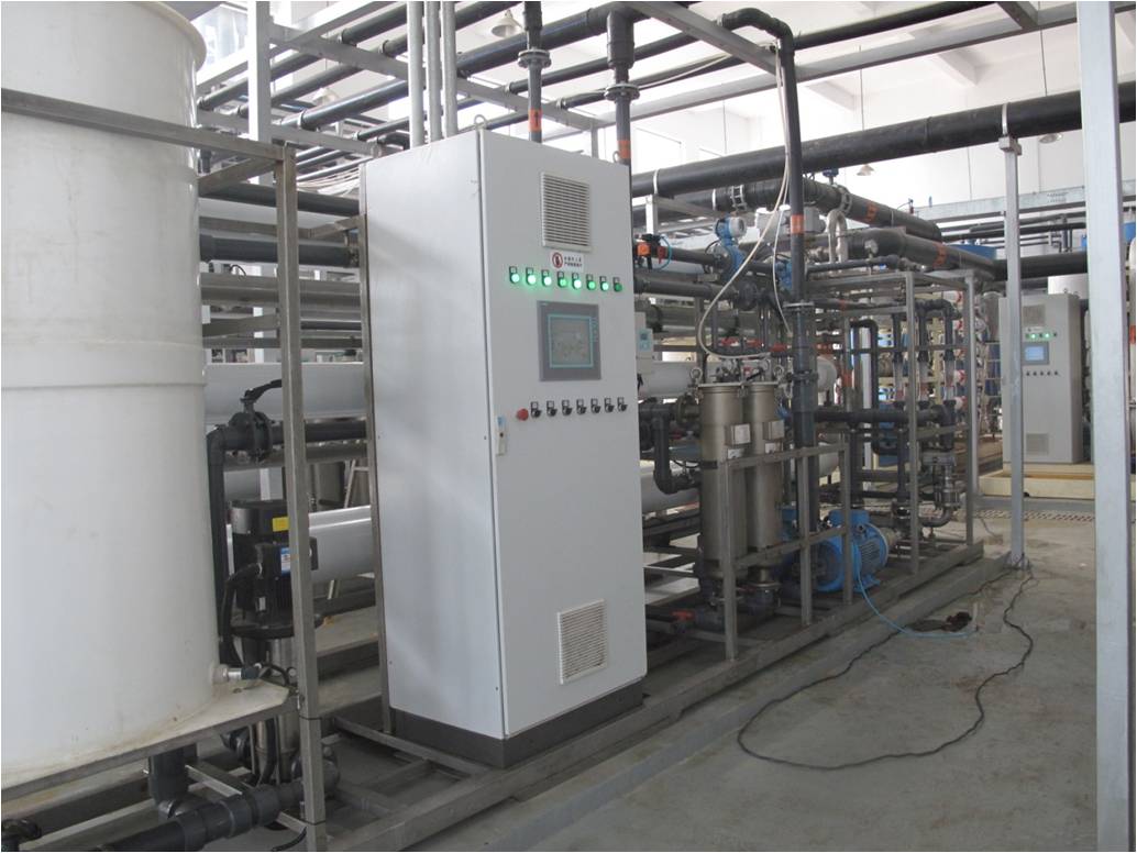 设备简介:18T/H RO反渗透纯水系统。 行业用途:电镀行业表面清洗用水 产水水质:小于5μs/cm 设备流程:原水→多介质过滤器→活性炭过滤器→精密过滤器→中间水箱→反渗透纯水设备→ 纯水储水箱→纯水泵→后置保安过滤器→用水点